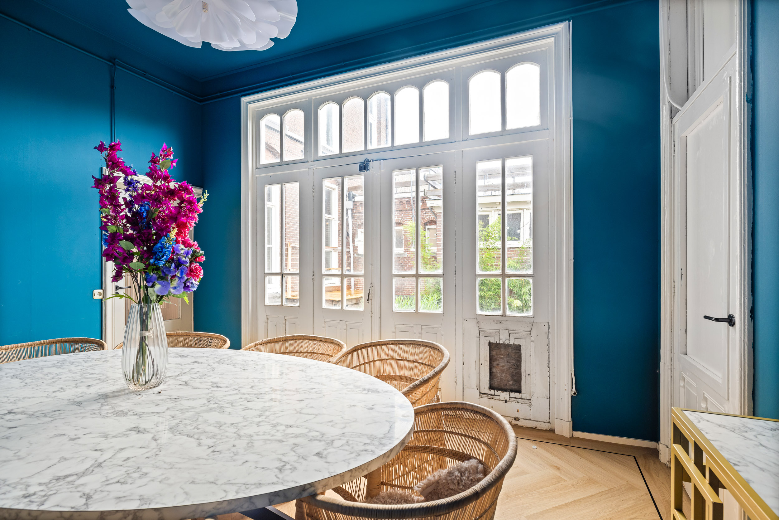Via de rechter voordeur betreedt men het woongedeelte, waar het originele troggewelf en de karakteristieke vloertegels direct de authentieke sfeer oproepen. De sfeervolle tuinkamer aan de achterzijde heeft rijk gedecoreerde openslaande deuren naar het terras en de diepe, zonnige patio-tuin met dubbel achterom. De ruime kelder vormt een ideale plek voor een fraaie wijnvoorraad.