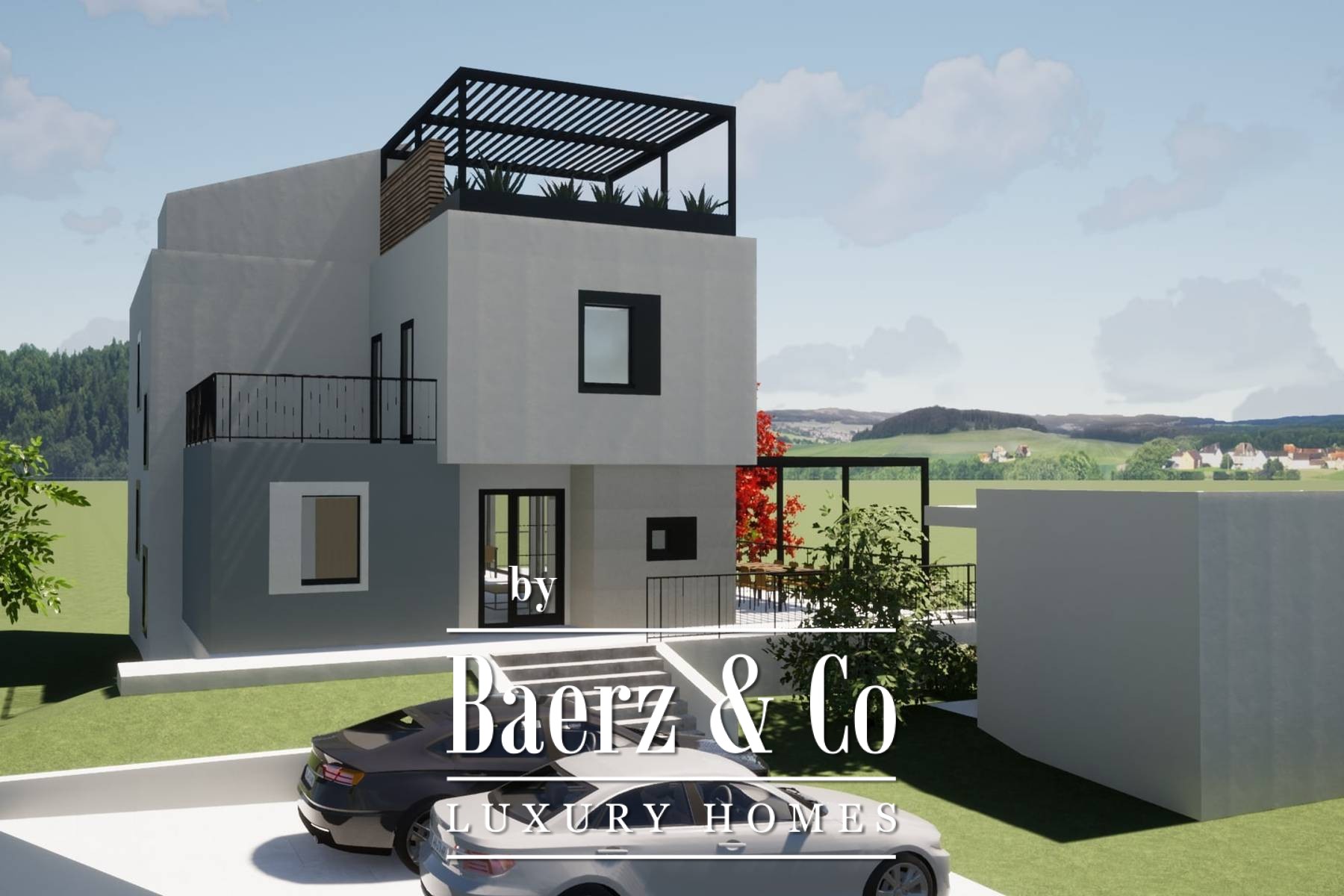 De entreeverdieping zet een verfijnde toon voor het dagelijks leven met een royale living, eetgedeelte en open keuken—allen uitkomend op het overdekte terras waar het speelse blauw van de zee steeds in beeld blijft. Op deze woonlaag bevinden zich tevens een slaapkamer, badkamer en gastentoilet, wat gemak harmonieus combineert met rust. De bovenverdieping herbergt vier extra slaapkamers; twee daarvan beschikken over een eigen en-suite badkamer, terwijl een gedeelde badkamer de overige kamers bedient. Alle vertrekken zijn georiënteerd op optimaal daglicht en ontspannen uitzicht. Op het dak nodigt een pergola met terras uit tot ultiem ontspannen en biedt een adembenemend uitzicht over de kustlijn en het groene dorp.