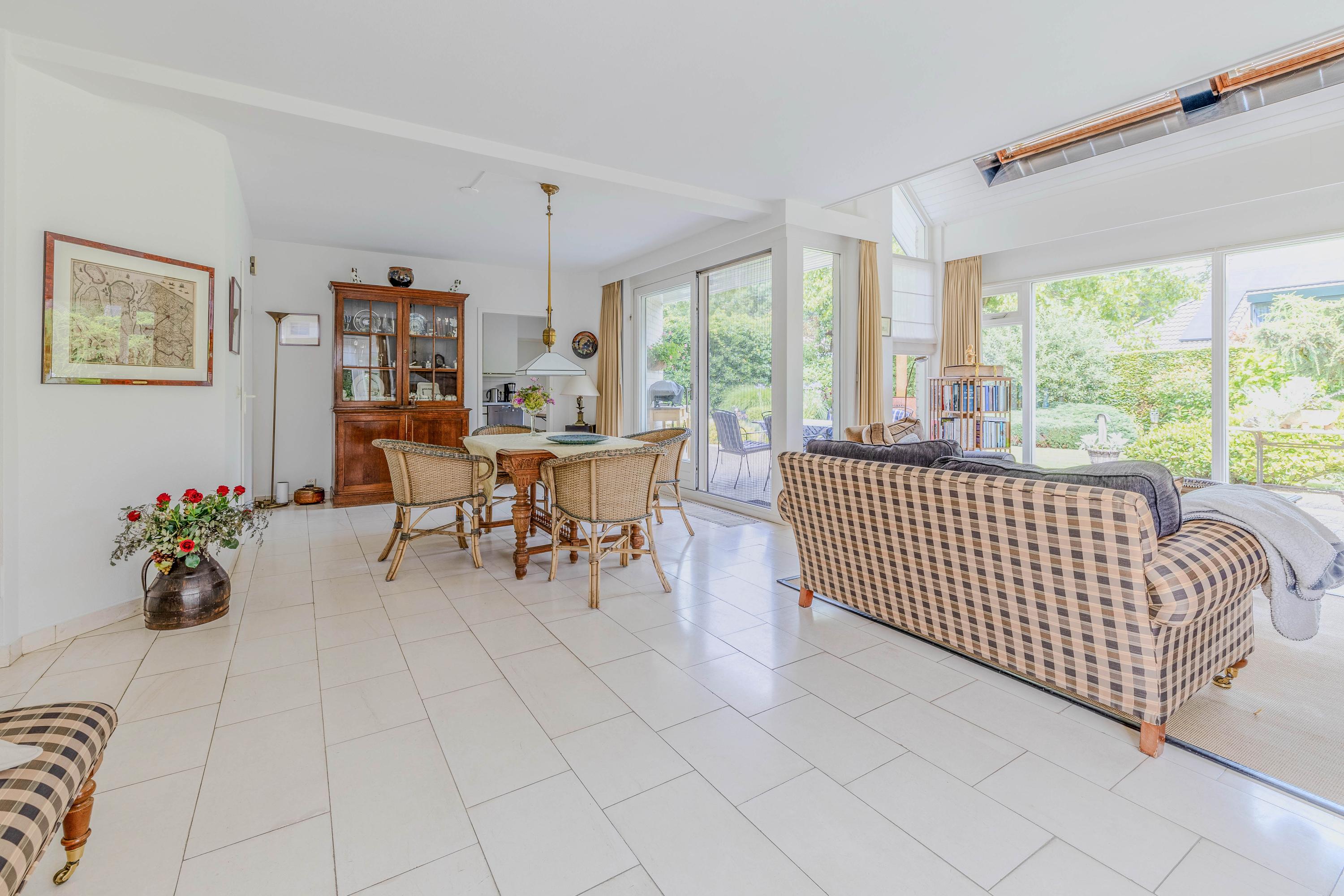 U kunt genieten van een ruime en lichte woonkamer van 62m² met een prachtig uitzicht op de mooi aangelegde tuin. De woonkamer is voorzien van een erker en een tv-hoek waar de fraaie architectuur mede door het dakvenster tot uitdrukking komt. Daarnaast is er een open haard aanwezig.
