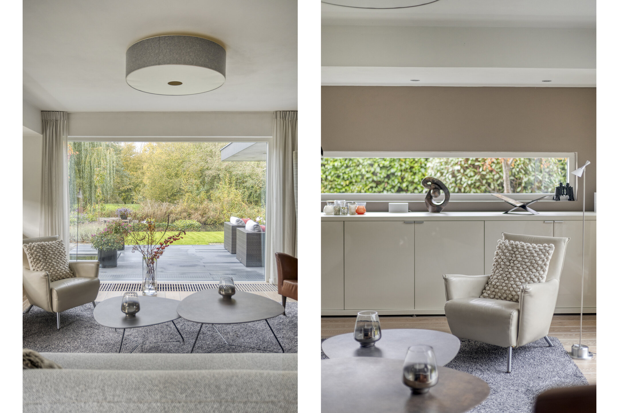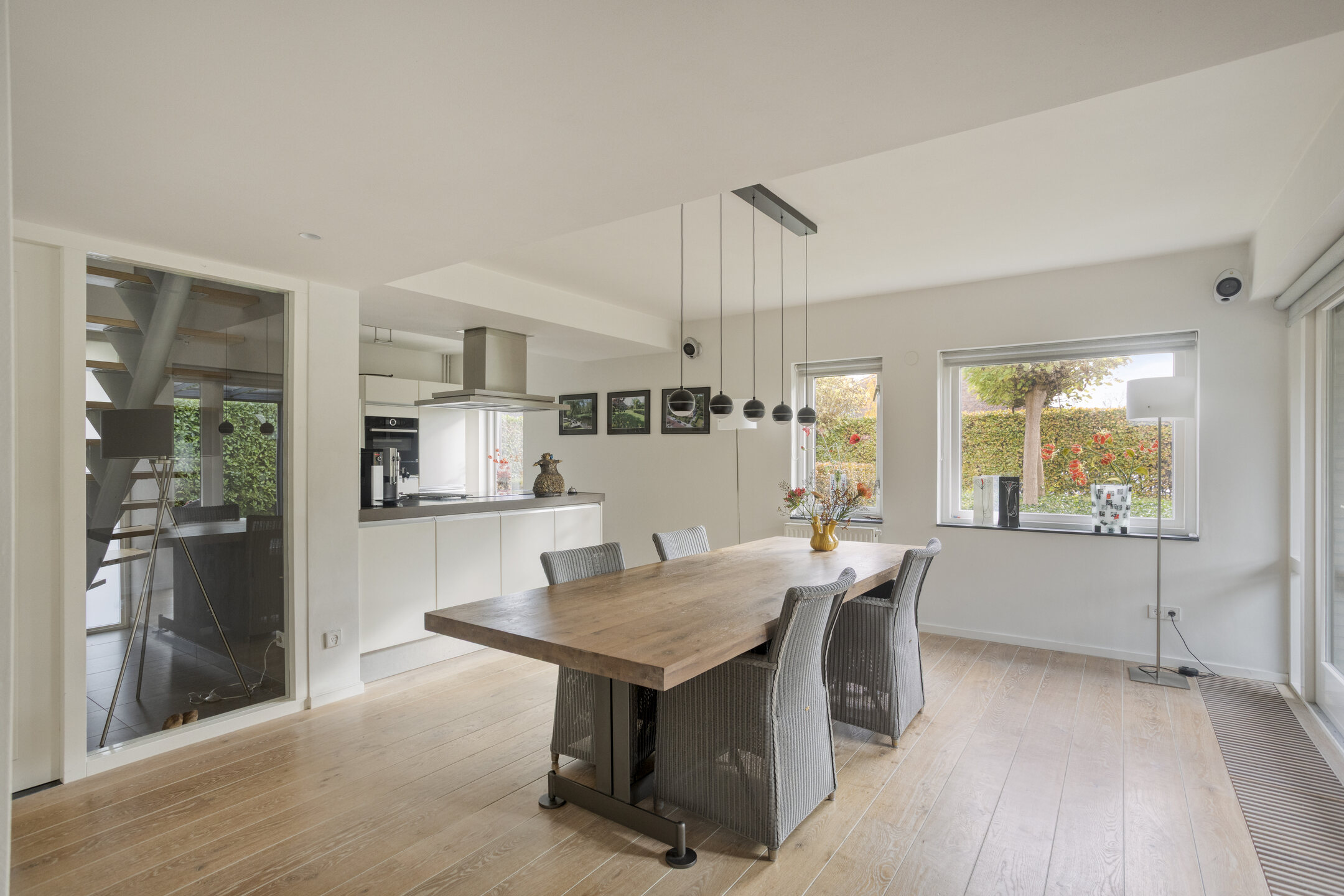 Просторный холл с дубовым полом и лаконичными стеклянными дверями встречает гостей при входе. Гостиная и кухня-столовая разделены двусторонним камином Bellfire, который придает пространству спокойное тепло. Роскошная кухня оснащена техникой премиального класса и рабочей поверхностью из бельгийского голубого камня, предлагая практичность и изысканный стиль для ежедневной жизни. Задний фасад с панорамным остеклением подчеркивает гармонию сада и живописный, охраняемый ландшафт Egmonderhout за его пределами.