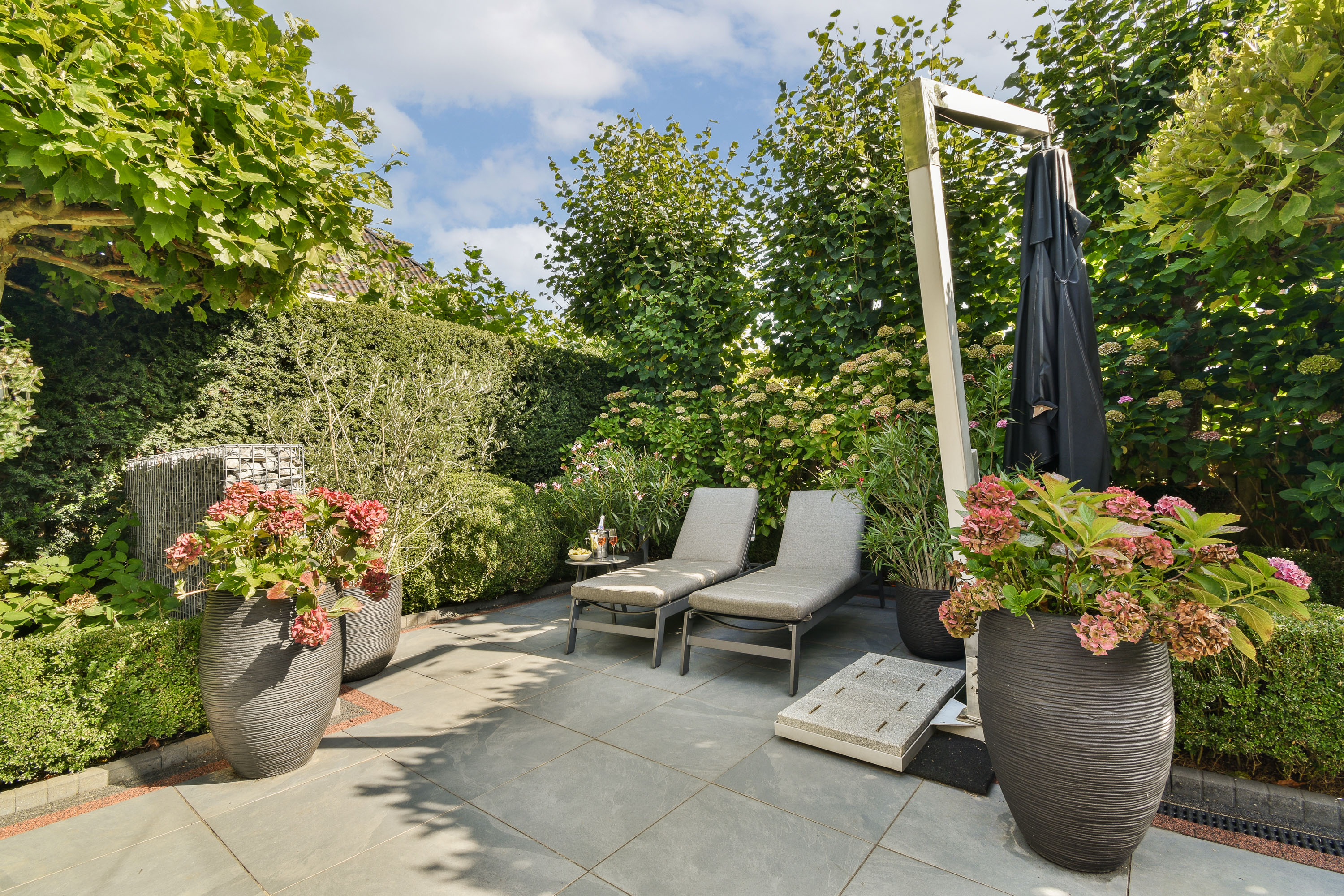 De tuin is rondom en opvallend fraai en verzorgd. Het begint al met de bestrate oprit met carport en de voortuin met planten. De zij- en achtertuin zijn eveneens zeer verzorgd aangelegd met hortensia's, planten, struiken en hagen, maar ook terrassen, electra en verlichting. Als kers op de taart is er een heerlijke en royale serre aangebouwd aan de woonkamer met een glazen (te openen) wand, electra en een dak met lichtstraat.