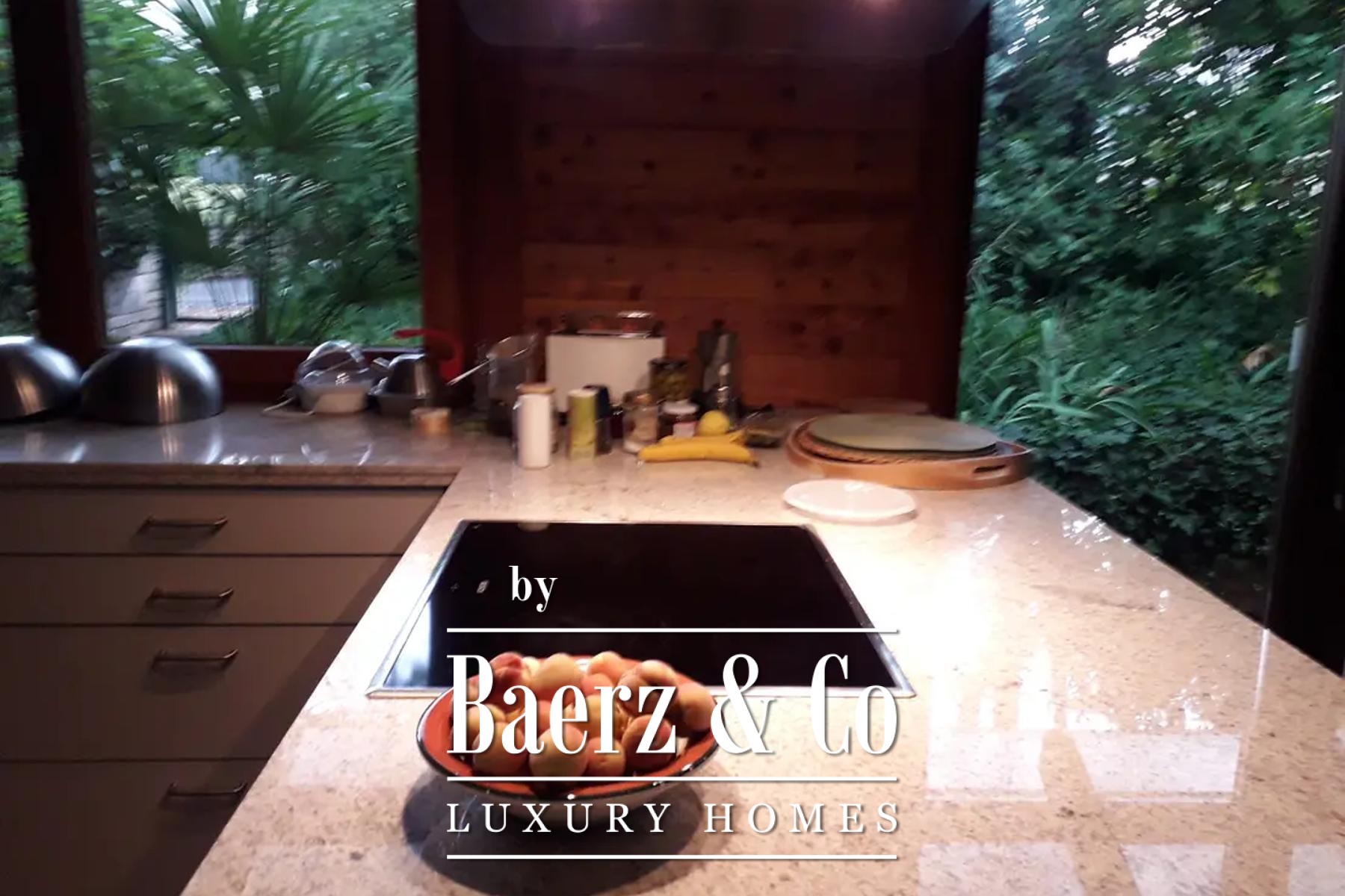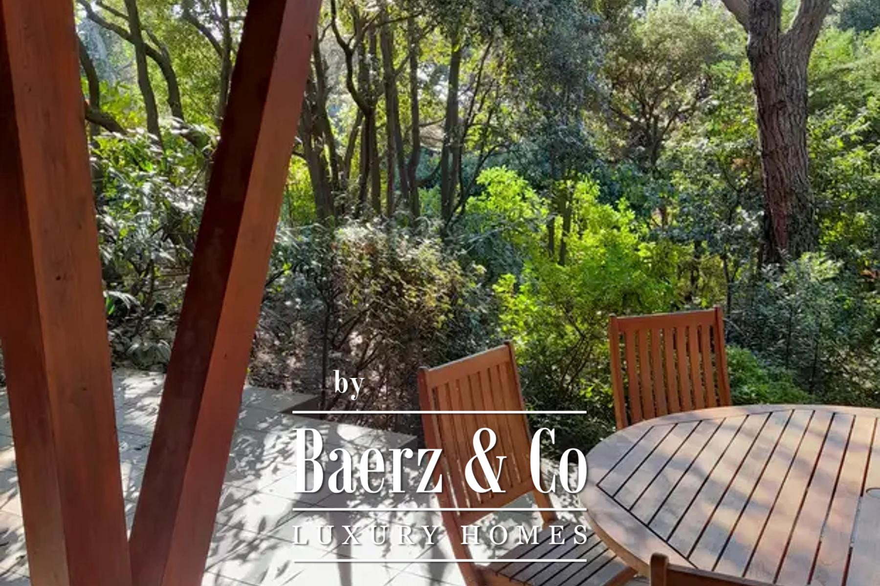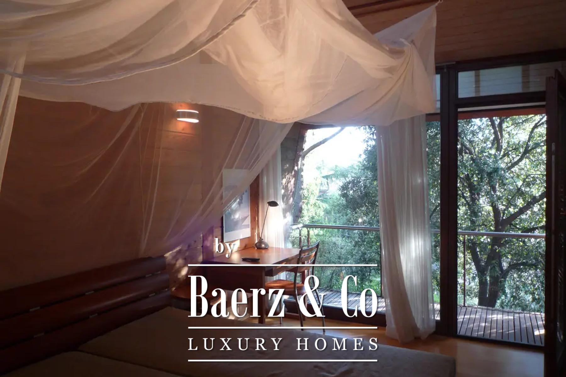 На верхнем уровне четыре спокойные спальни выходят на балконы, а галерея и тенистая терраса ведут к уединенному пространству на крыше для созерцательных моментов над садом. На нижнем этаже размещены летняя кухня с панорамным остеклением и оздоровительная зона с сауной, бассейнами и благоустроенной террасой, а в подвале предусмотрены помещения для хранения, инженерные системы и прачечная.