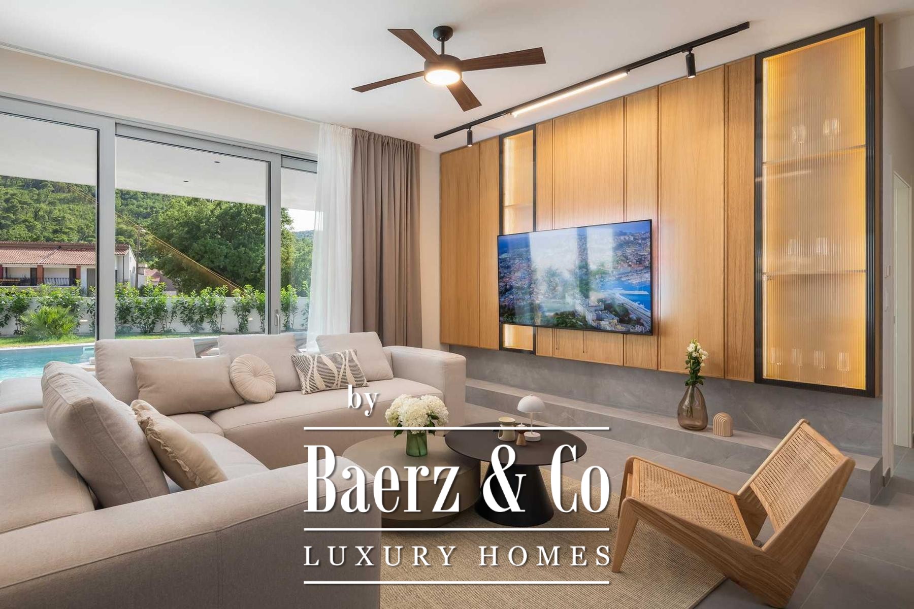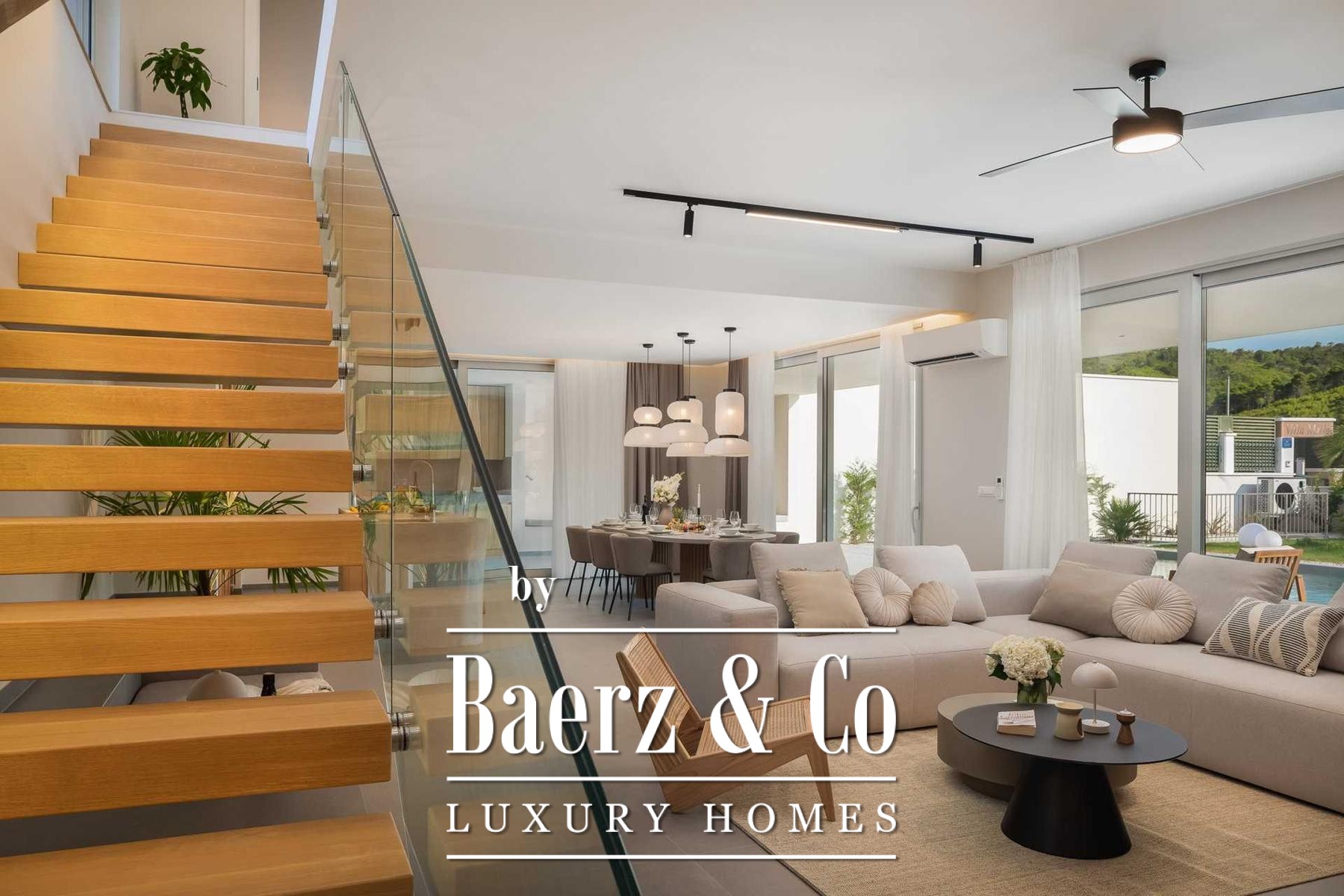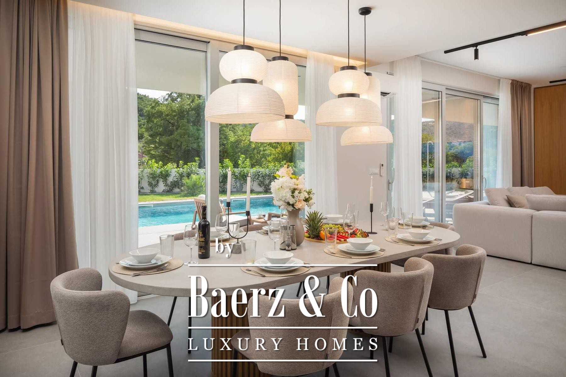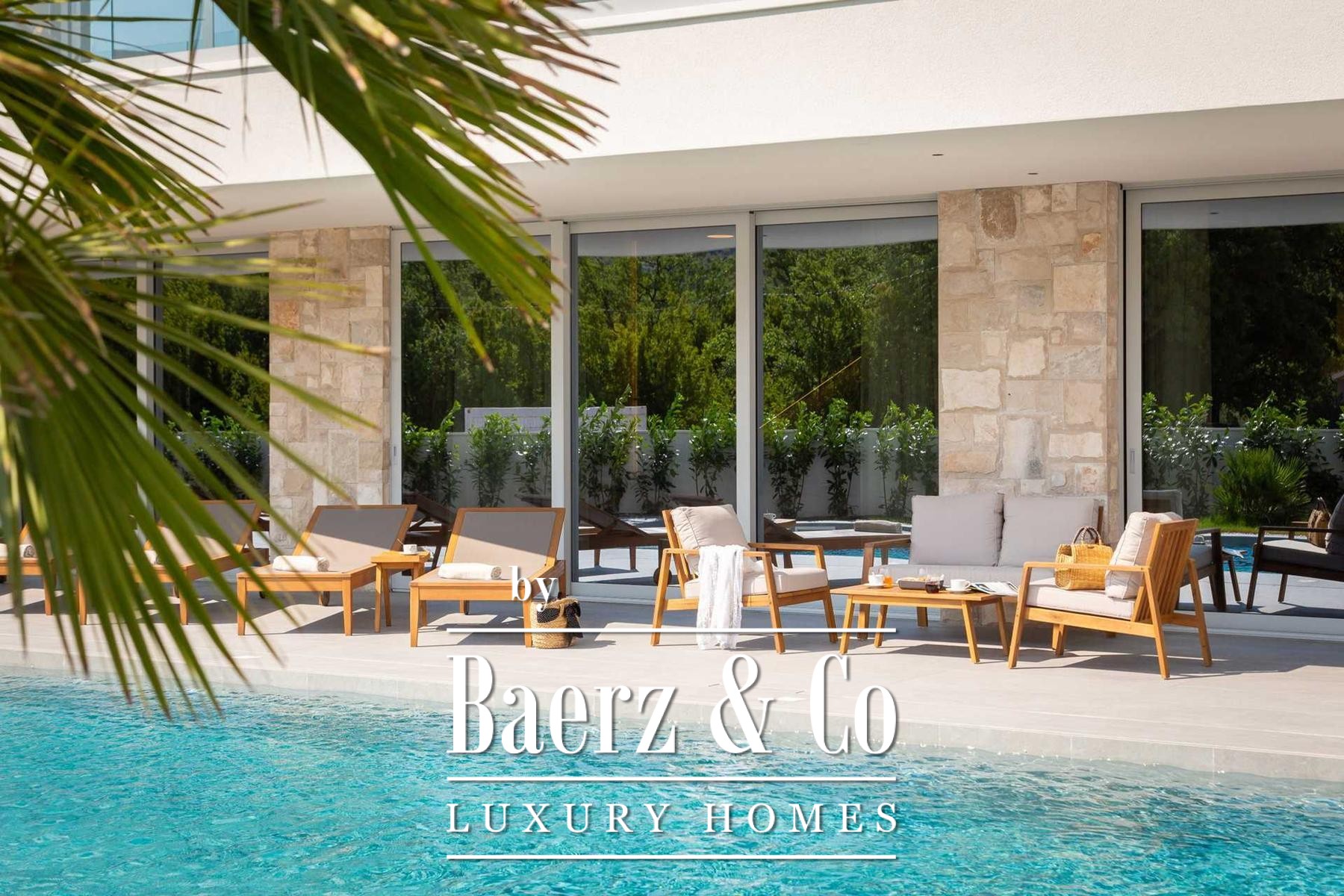 Located in a quiet area in the surroundings of Split, on a spacious plot of 2,090 m², this modern and luxuriously appointed villa with a heated swimming pool offers exceptional comfort, privacy, and functionality. The property is arranged over two floors and is ideal for both private living and high-end rental purposes.The ground floor consists of an entrance hall, a fitness room with sauna, a bathroom, a separate toilet, and a spacious open-plan living area comprising a fully equipped kitchen, dining area, and living room. Large glass walls allow abundant natural light and create a seamless connection between the interior and exterior spaces. From the kitchen, there is access to a covered terrace with an outdoor kitchen and barbecue, while the dining and living areas open onto an additional covered terrace leading to the sun deck and heated swimming pool.The upper floor is dedicated to the sleeping area and features four bedrooms, each with its own en-suite bathroom, as well as a shared storage room.The villa has been designed with great attention to detail, harmoniously combining contemporary design, high-quality materials, and functionality.In addition to the swimming pool and sunbathing area, the fully fenced and landscaped garden offers a children’s playground (football and basketball), a bocce court, and ample parking space for several vehicles.The property enjoys an excellent location, providing peace and privacy while remaining within easy reach of all amenities and infrastructure offered by the city of Split.For further information or to arrange a viewing, please feel free to contact us.