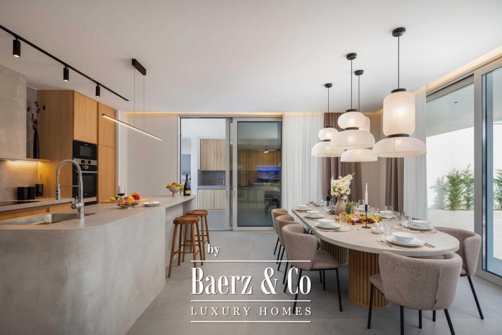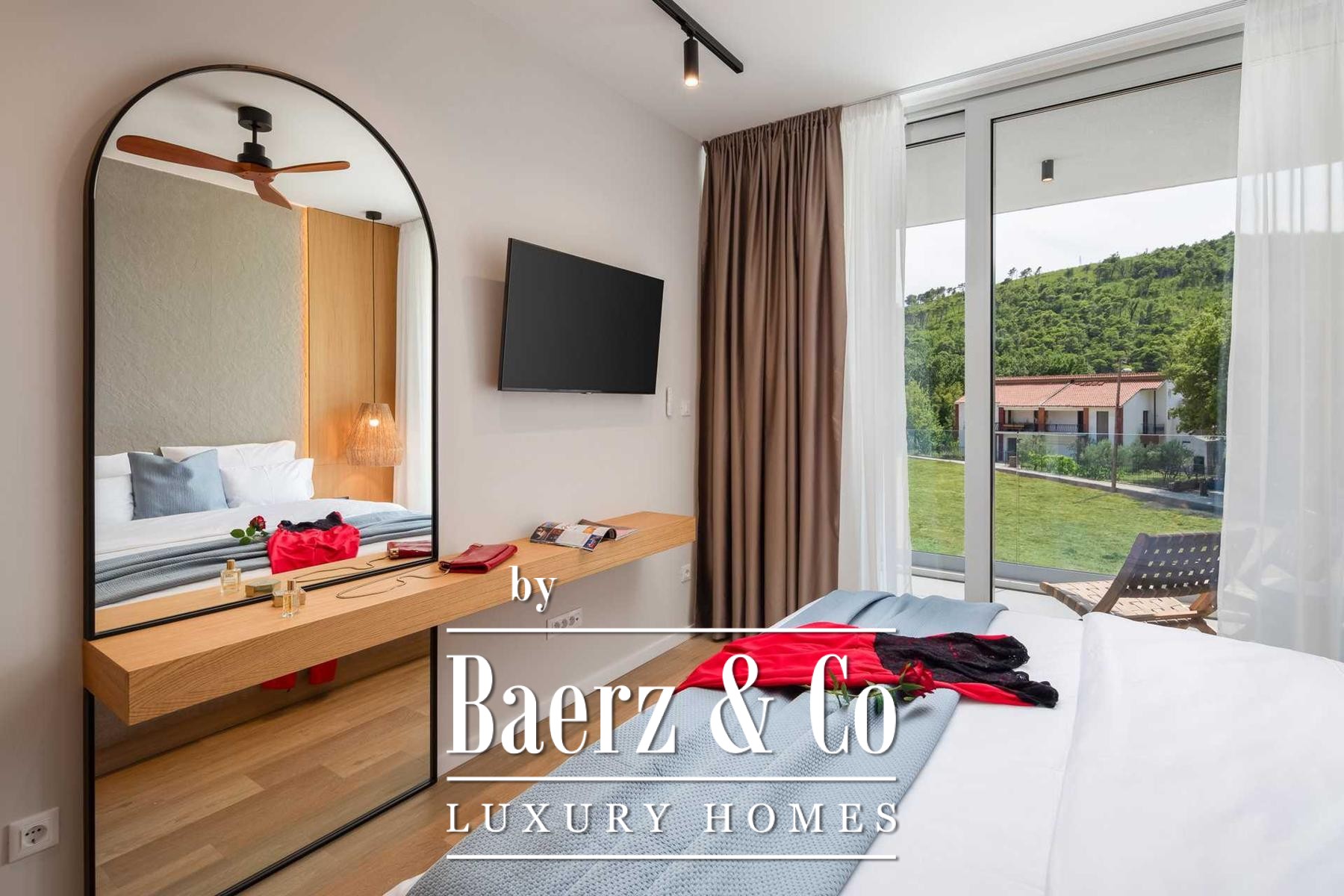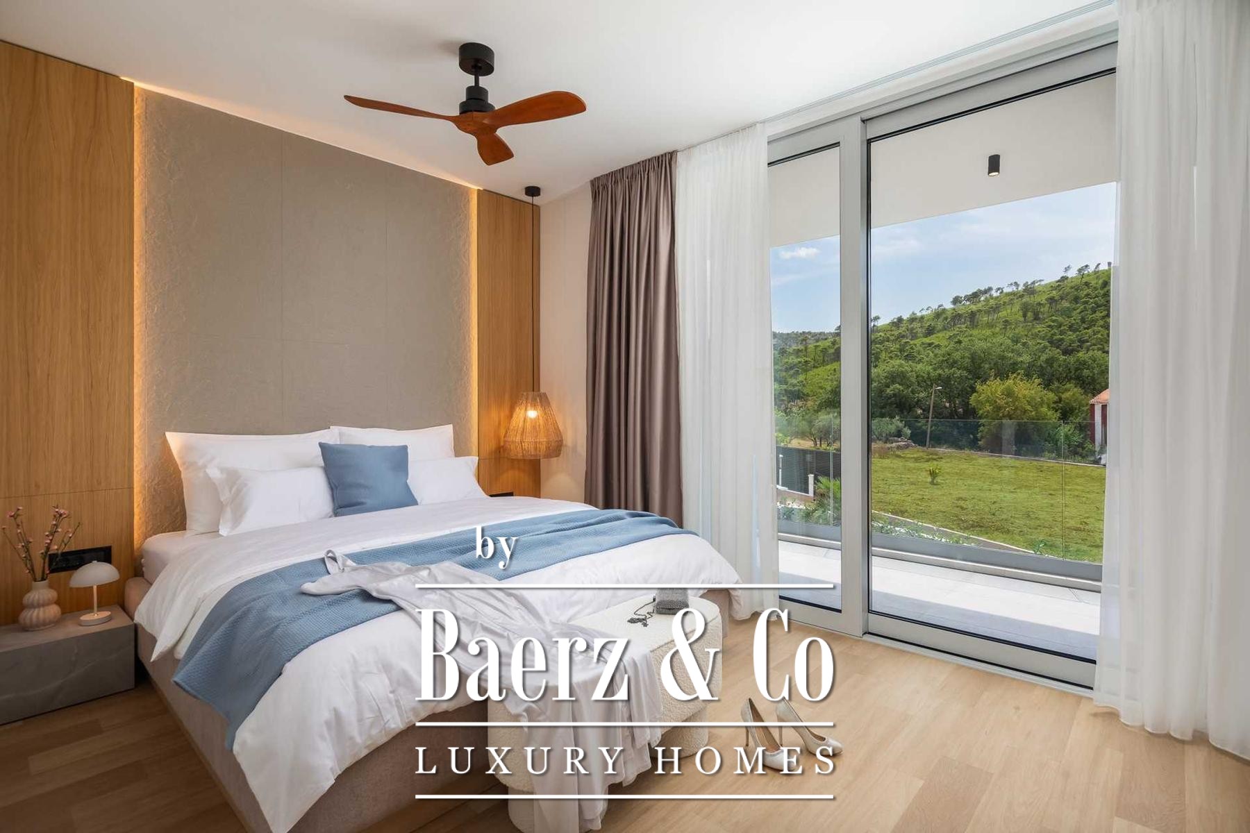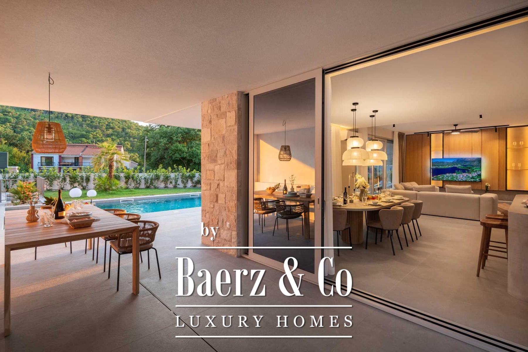 Located in a quiet area in the surroundings of Split, on a spacious plot of 2,090 m², this modern and luxuriously appointed villa with a heated swimming pool offers exceptional comfort, privacy, and functionality. The property is arranged over two floors and is ideal for both private living and high-end rental purposes.The ground floor consists of an entrance hall, a fitness room with sauna, a bathroom, a separate toilet, and a spacious open-plan living area comprising a fully equipped kitchen, dining area, and living room. Large glass walls allow abundant natural light and create a seamless connection between the interior and exterior spaces. From the kitchen, there is access to a covered terrace with an outdoor kitchen and barbecue, while the dining and living areas open onto an additional covered terrace leading to the sun deck and heated swimming pool.The upper floor is dedicated to the sleeping area and features four bedrooms, each with its own en-suite bathroom, as well as a shared storage room.The villa has been designed with great attention to detail, harmoniously combining contemporary design, high-quality materials, and functionality.In addition to the swimming pool and sunbathing area, the fully fenced and landscaped garden offers a children’s playground (football and basketball), a bocce court, and ample parking space for several vehicles.The property enjoys an excellent location, providing peace and privacy while remaining within easy reach of all amenities and infrastructure offered by the city of Split.For further information or to arrange a viewing, please feel free to contact us.