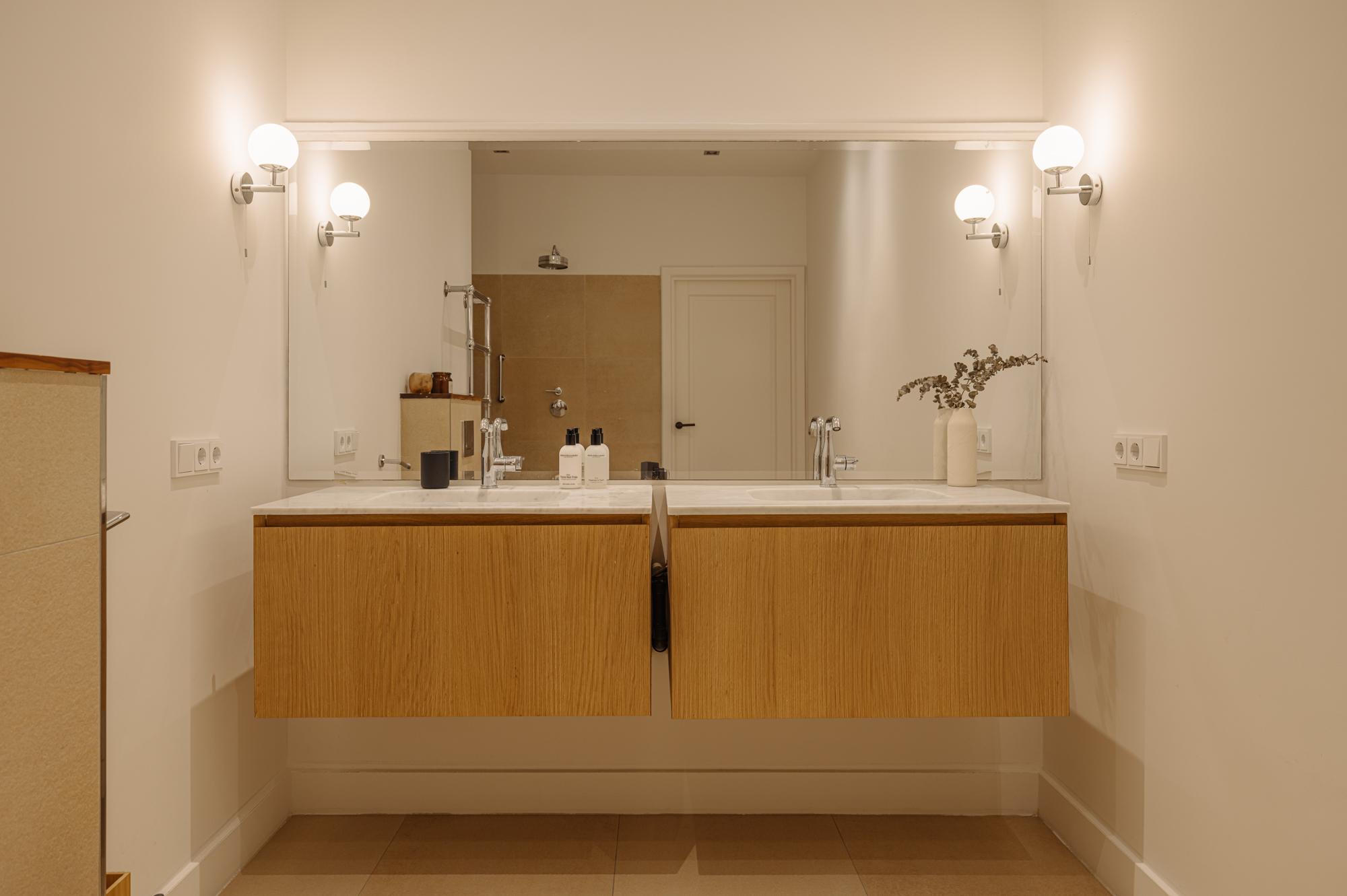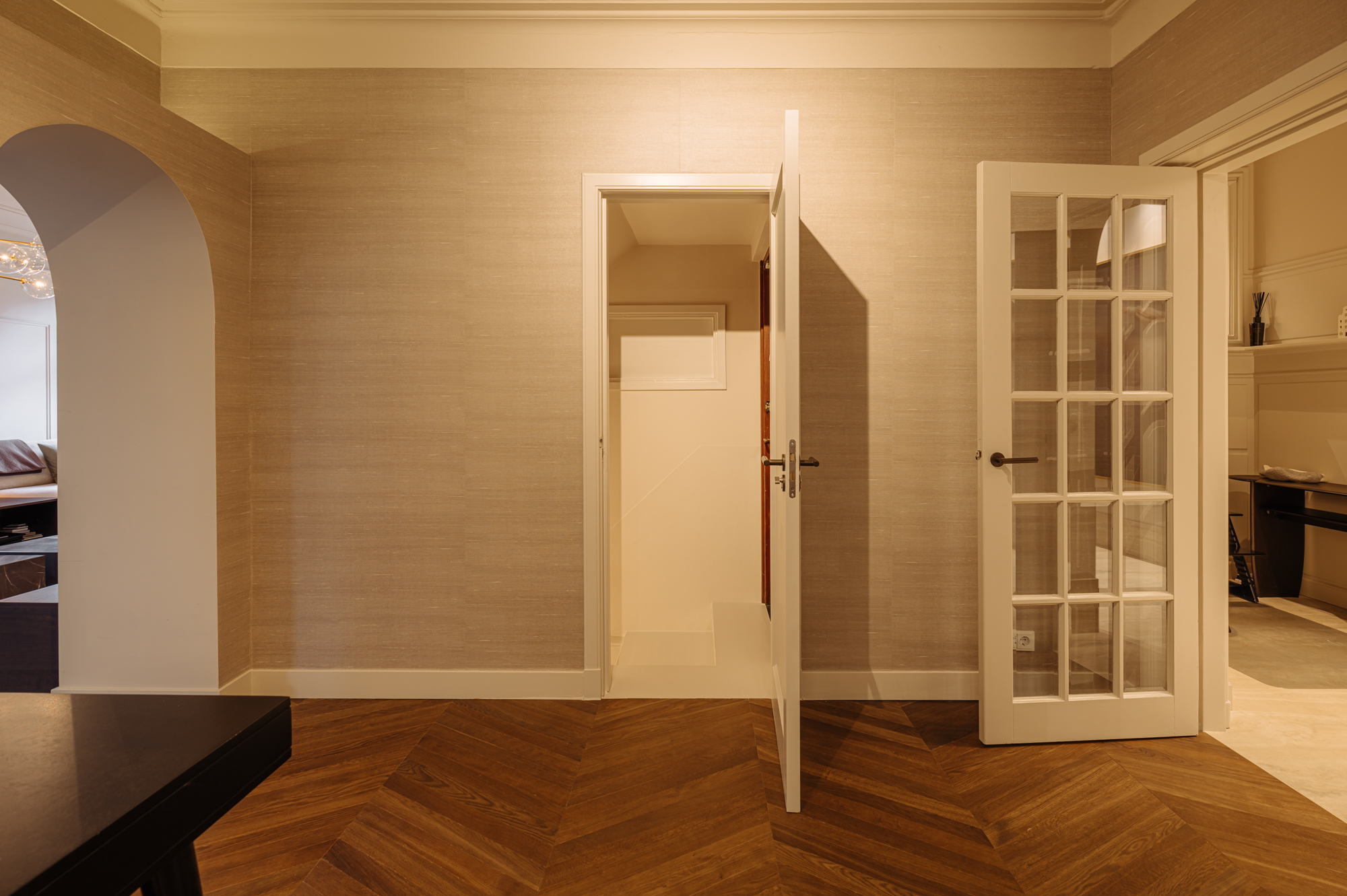法式落地门引入充足阳光,通向约36平方米、朝西南的花园,将空间感延伸至户外。公寓布局包括多功能玄关、可作书房或次客厅的空间,以及下沉一层的两间额外房间(净高2.23米),为居住和储物带来灵活性。玄关、浴室和厨房均配有地暖,提升日常舒适度。