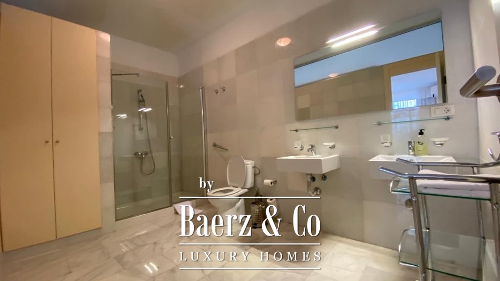 别墅布局为三层结构,每层均有私人电梯连接。六间卧室均配有嵌入式衣柜与精致装饰,营造静谧与私密。主卧套房位于顶层,旁设私人书房及带烧烤区的露台。多间卧室直通光线充足的私人露台。四间卫浴设计兼具便利与舒适,部分设有浴缸,部分为步入式淋浴间。