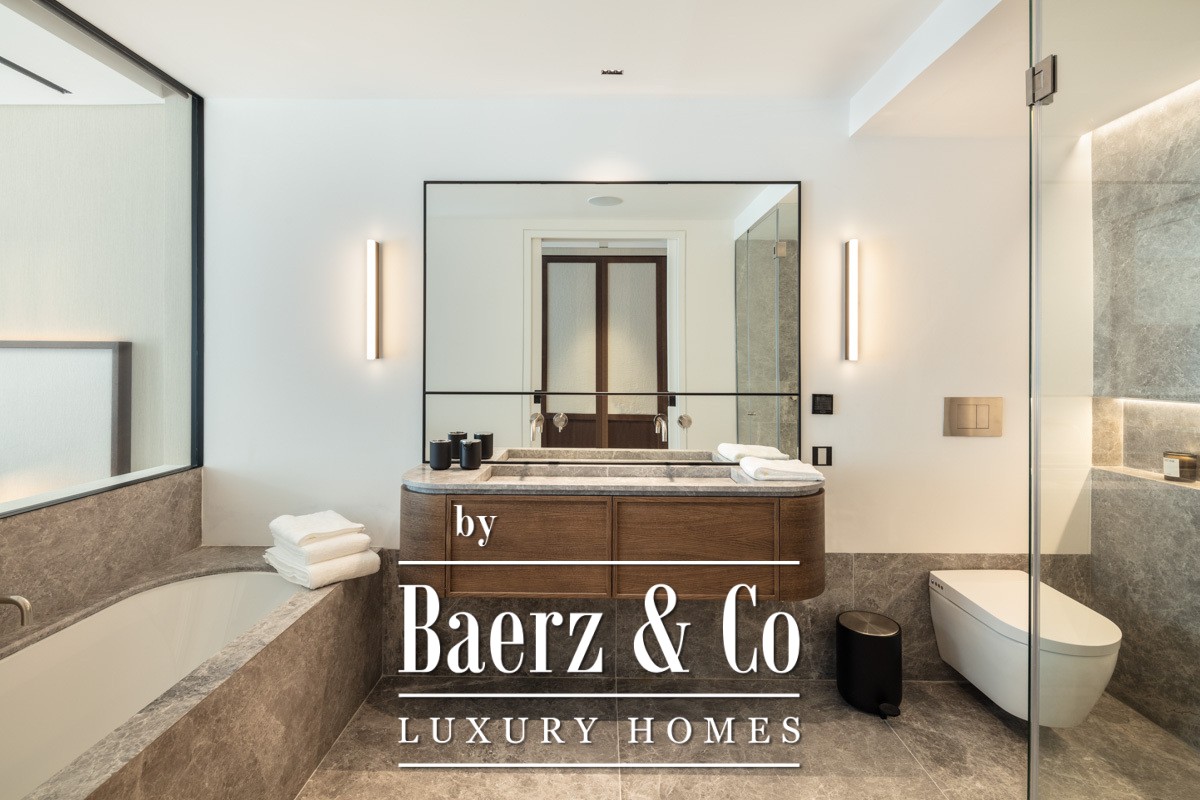 厨房配备大理石饰面及隐蔽式家电布局,无论精致待客还是日常生活都游刃有余。宽敞的有顶露台将室内空间向外延展,适合户外用餐与休闲放松,主卧与客厅均可直接通往。三间卧室各自配有高档套内卫浴,主卧配备隐私玻璃隔断与灰色石材双台盆,营造出专属安静休憩角落。