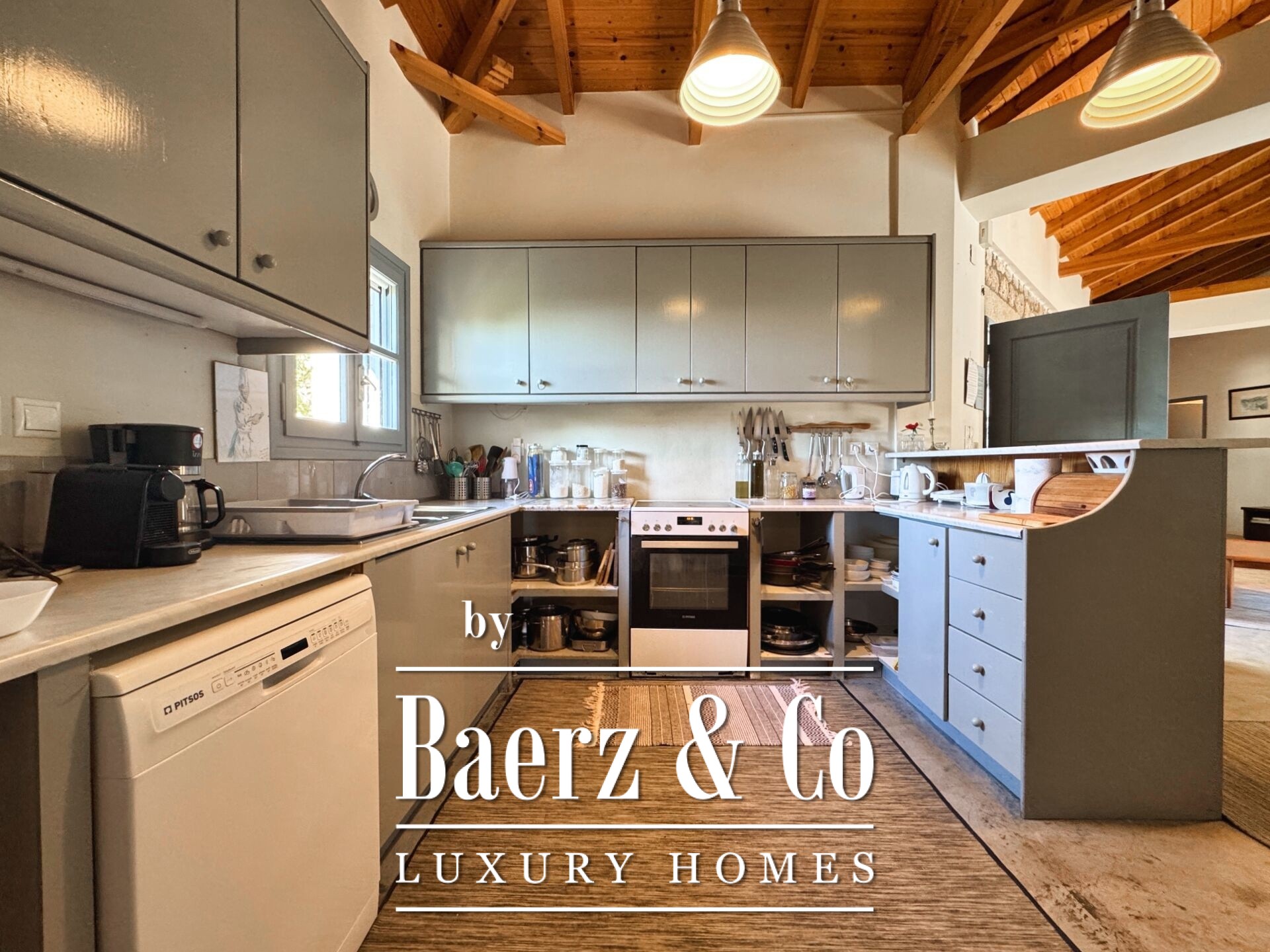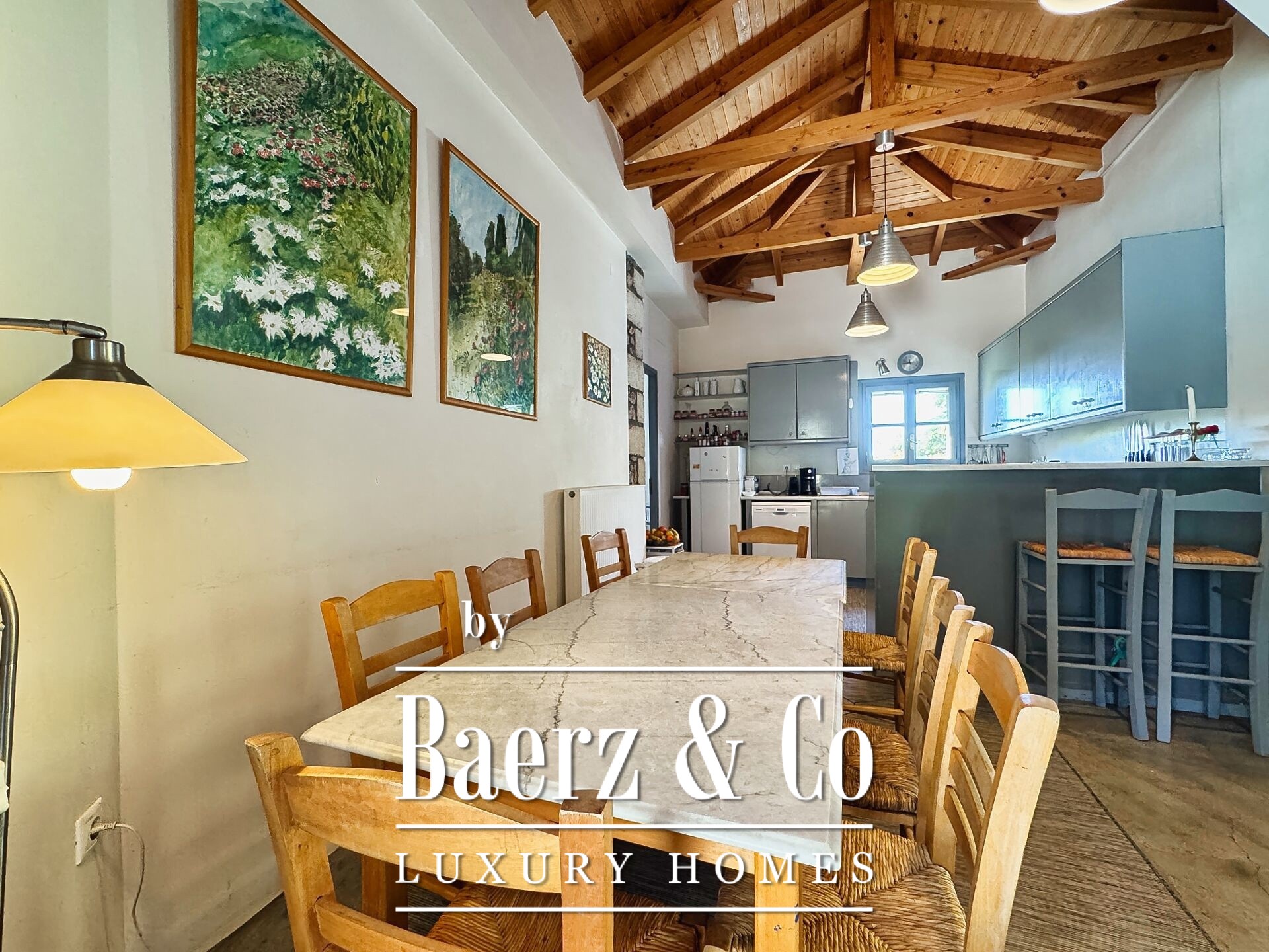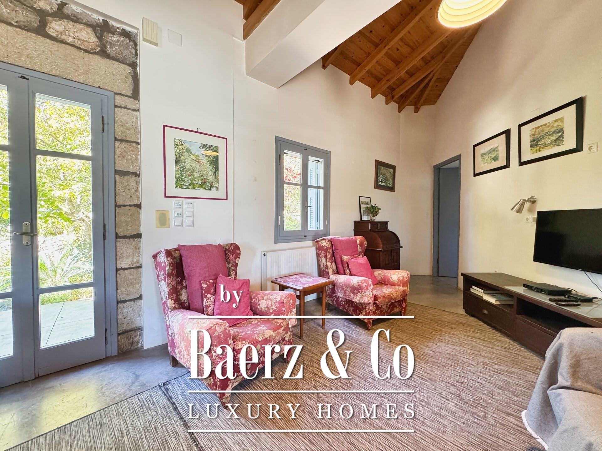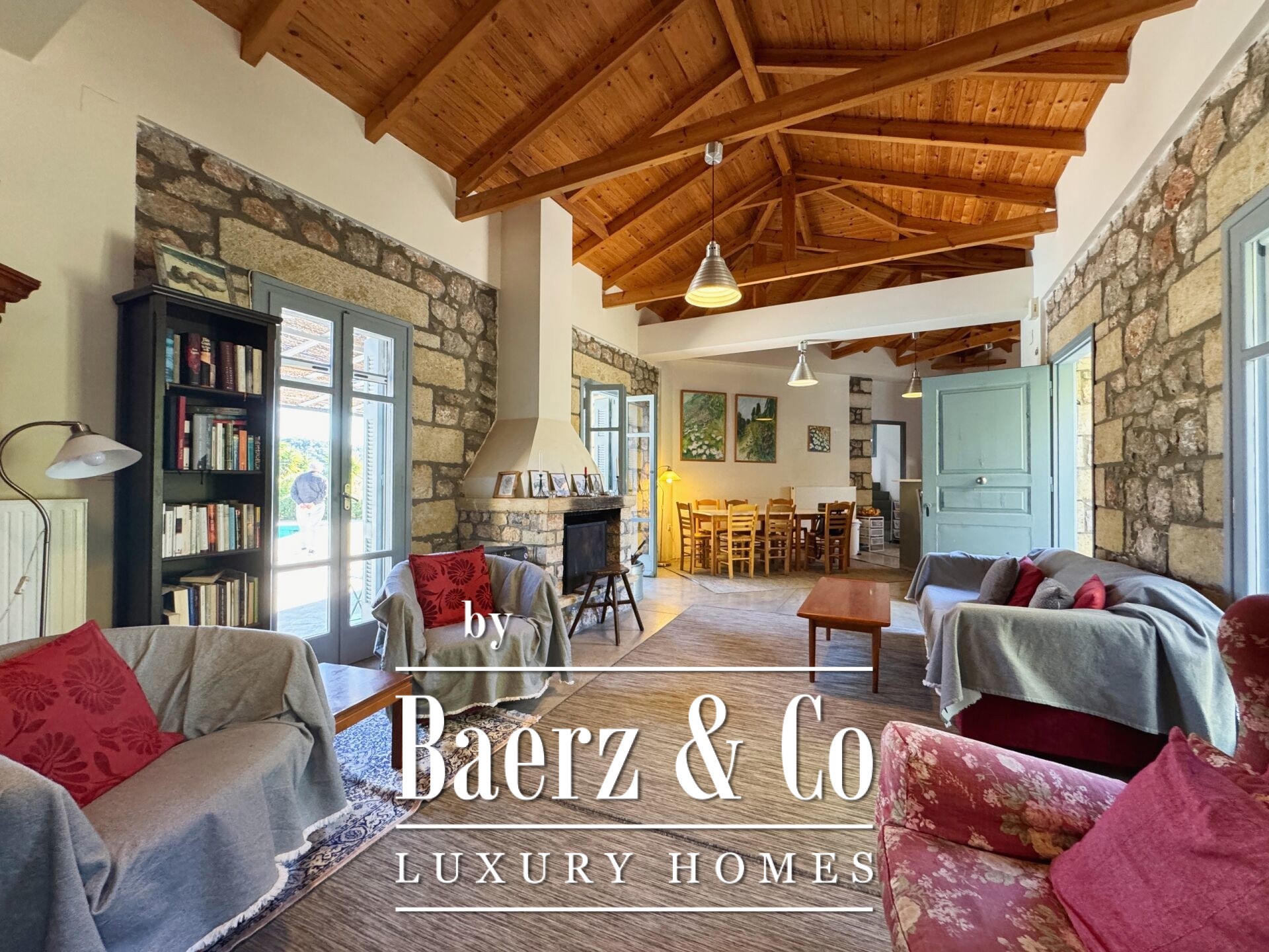 住宅以精湛的石材建造和细致入微的设计为特色。底层设有开阔的起居区与厨房,五间卧室和四间浴室,每一处细节均达到高标准,无论是家人还是宾客皆能享受私密与舒适。室内走廊延展至两座各具特色的石塔,每塔设有一间卧室,区分空间的同时,赋予居所独特的建筑韵律。